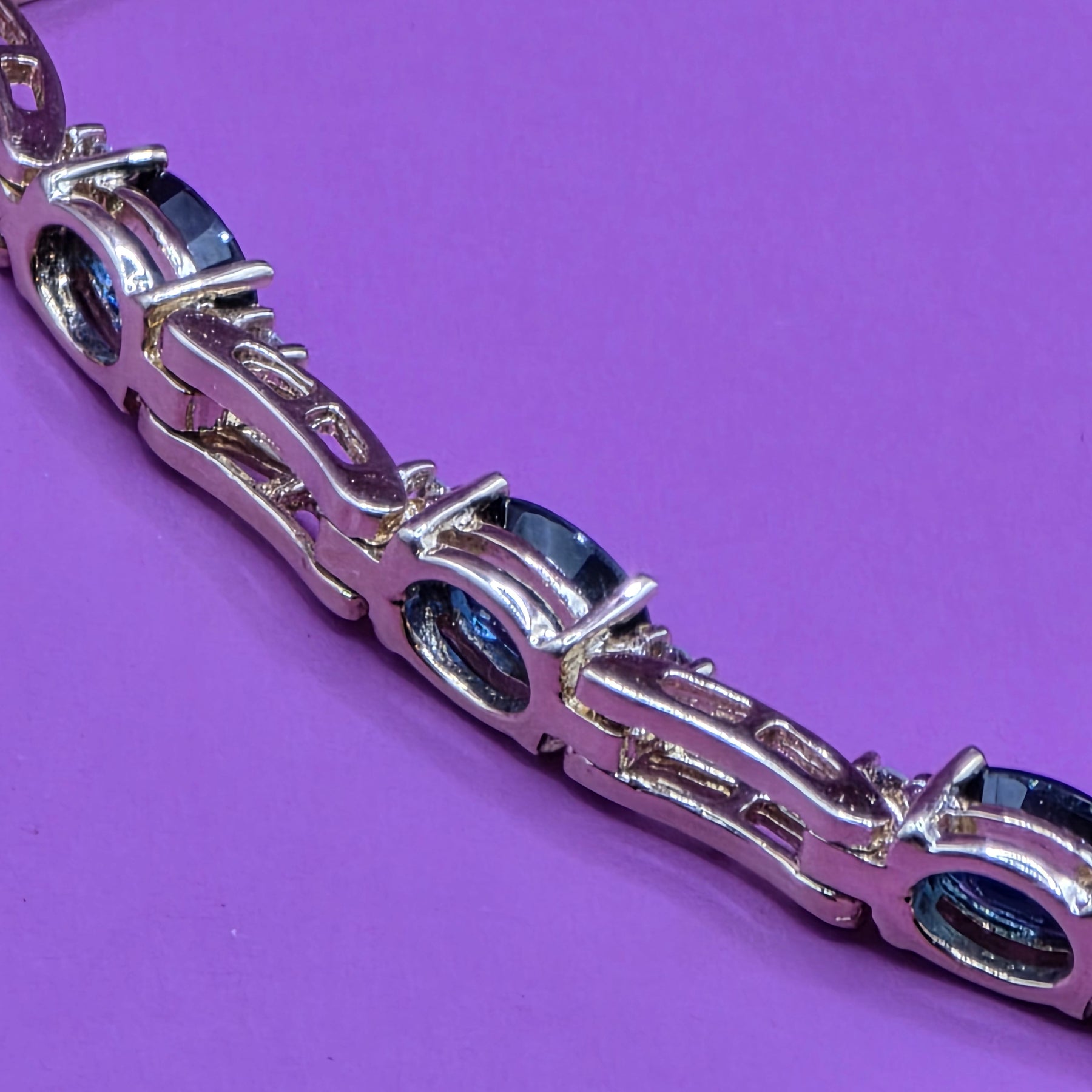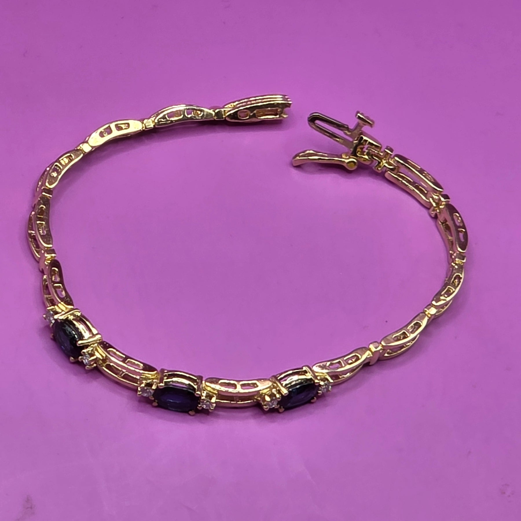 Features: Solid 14k yellow gold; 3 oval sapphire stations; each sapphire is (est) .25 carat accented with a diamond chip on either side; long section link design