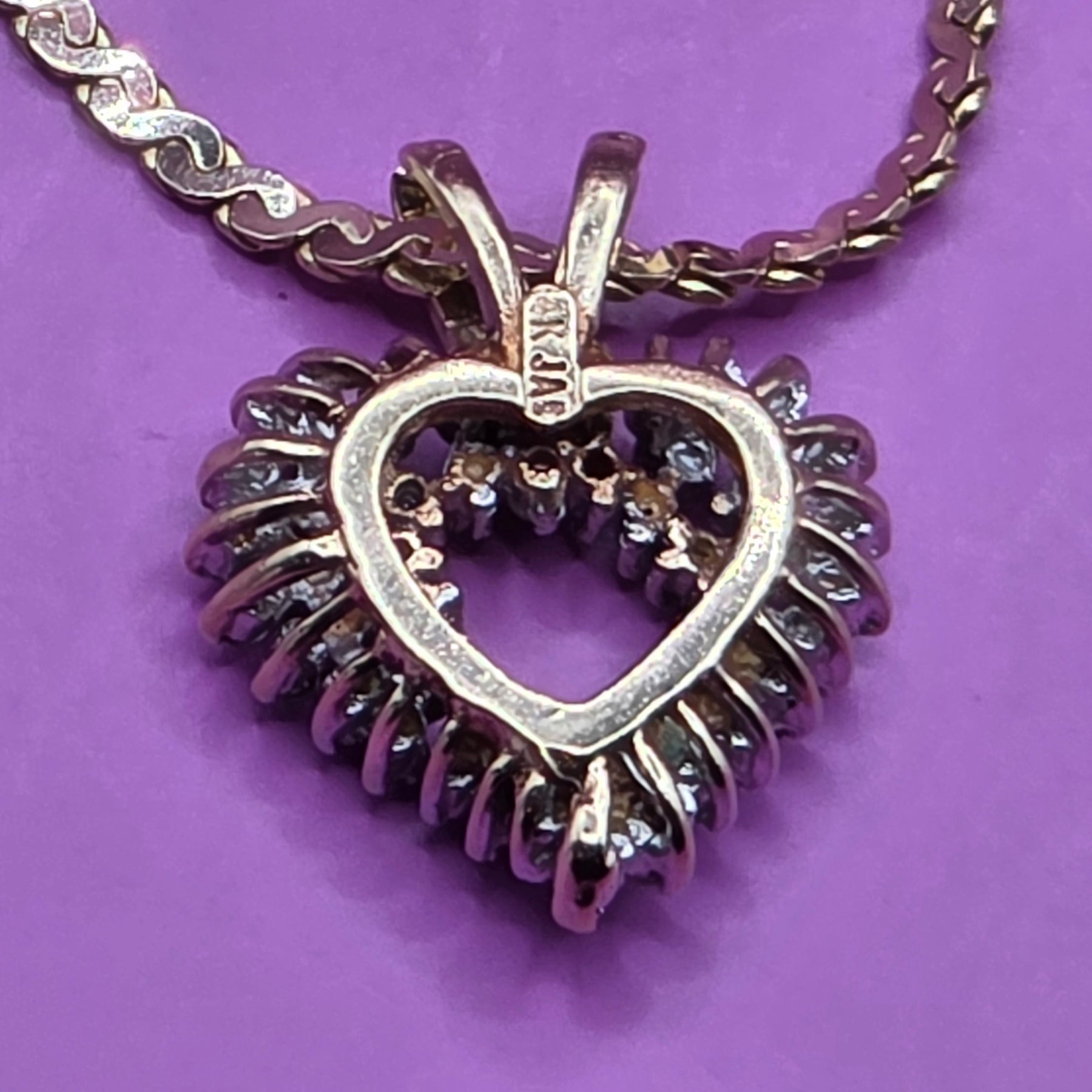 Features: solid 14k yellow gold; symmetrical heart pendant encrusted with 50 round cut, prong set stones; "S" link choker necklace