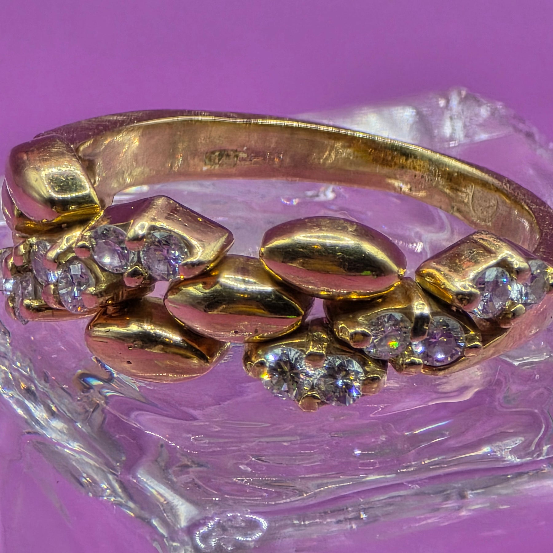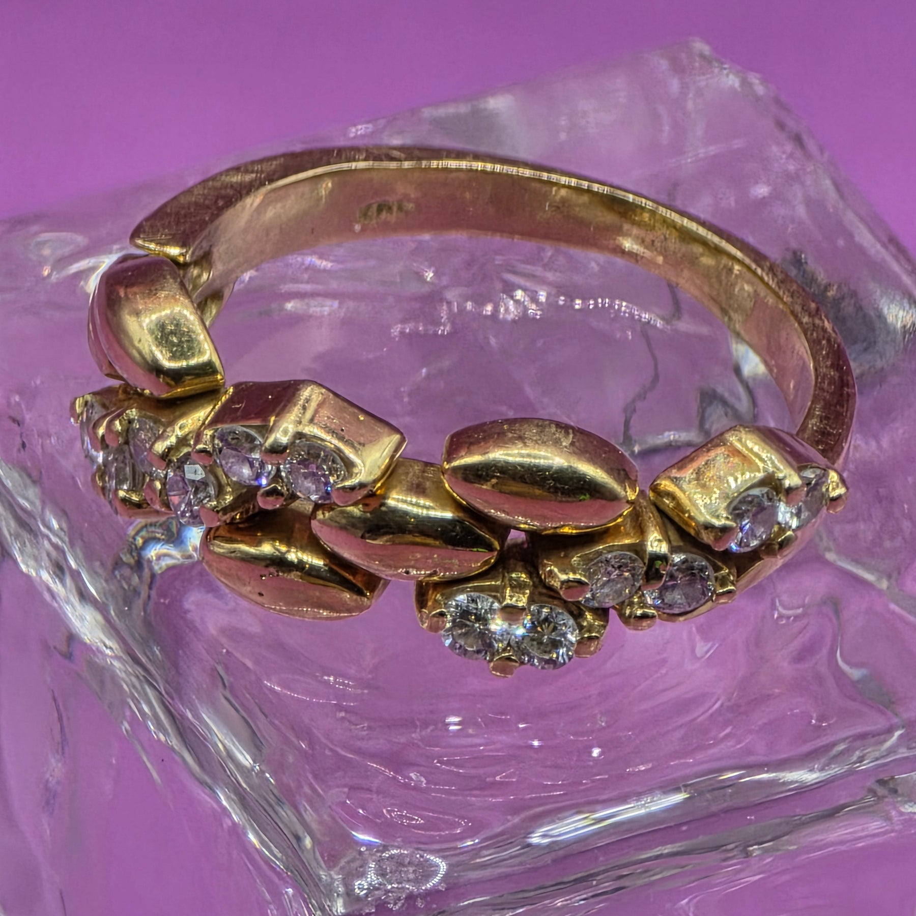 Additional info: this ring features a very unique design. The top is not only visually appealing but it also flexes - it is not a traditional rigid surface. The marquise cut stones are a perfect compliment to the alternating oval gold stations