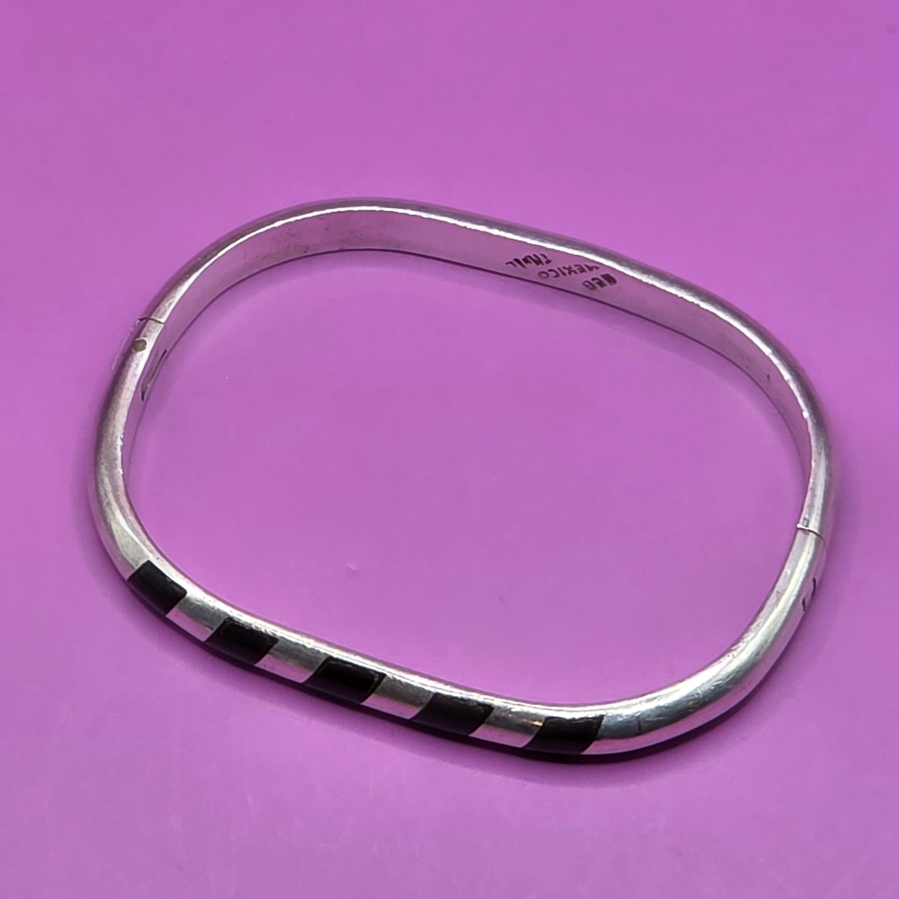 A simple yet beautiful traditional bracelet - heavy rigid bangle inlaid with polished onyx - It's a great addition to anyone's sterling jewelry collection.
