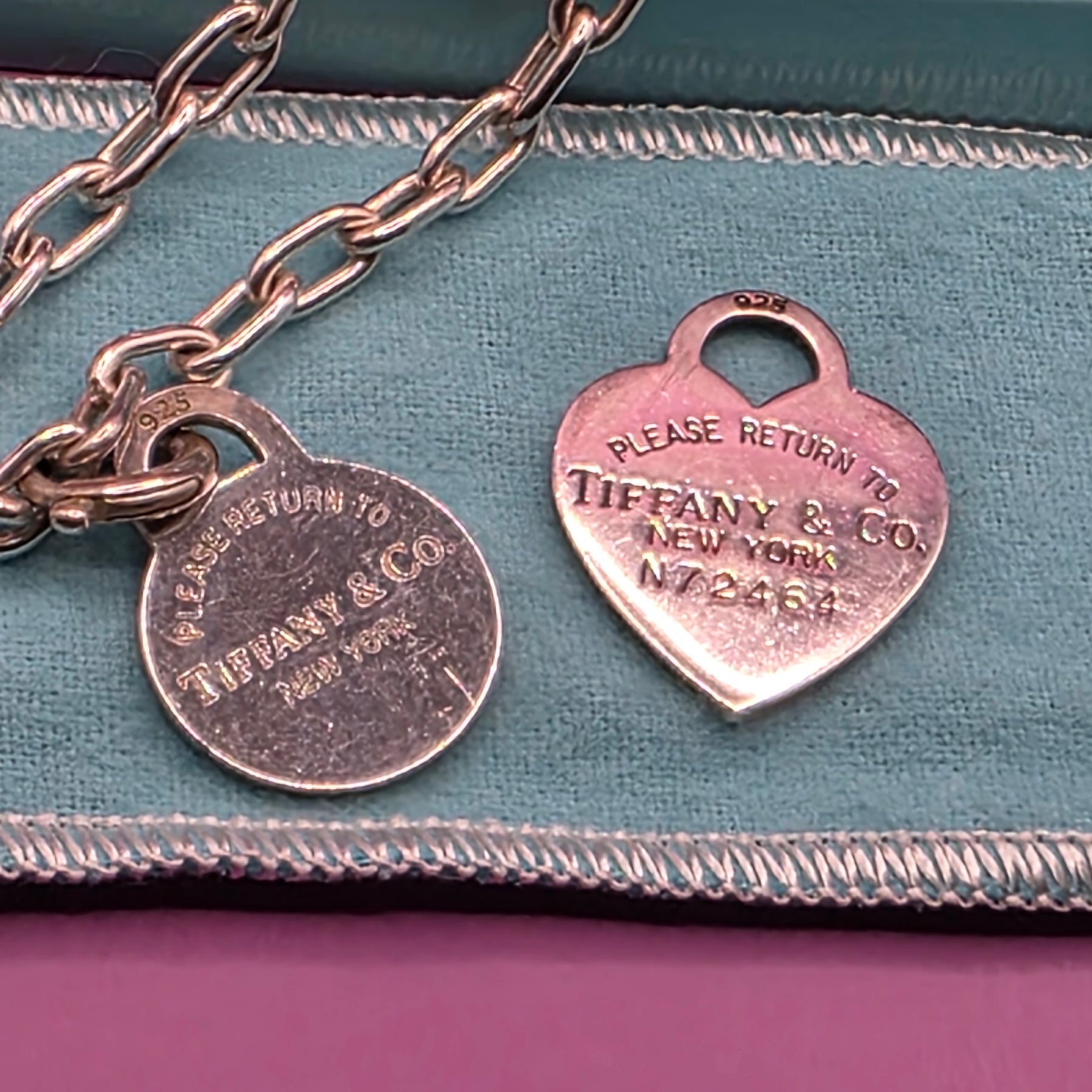 Tiffany & Co. long like chain necklace with not 1, but 2 pendants - one round, the other heart shaped. The back of each pendant is smooth and ready for engraving. Blue felt bag and presentation box is included - perfect to give as a gift.