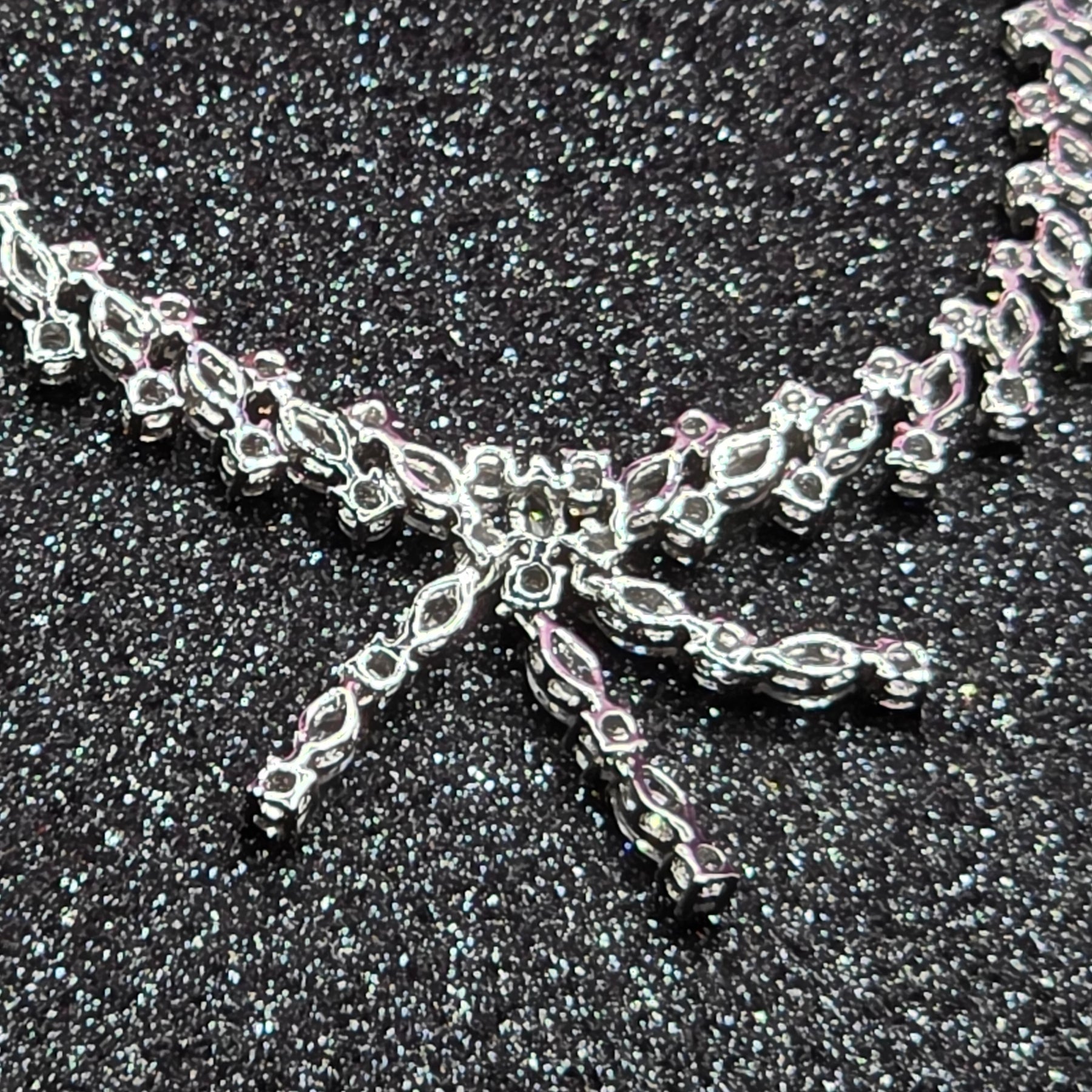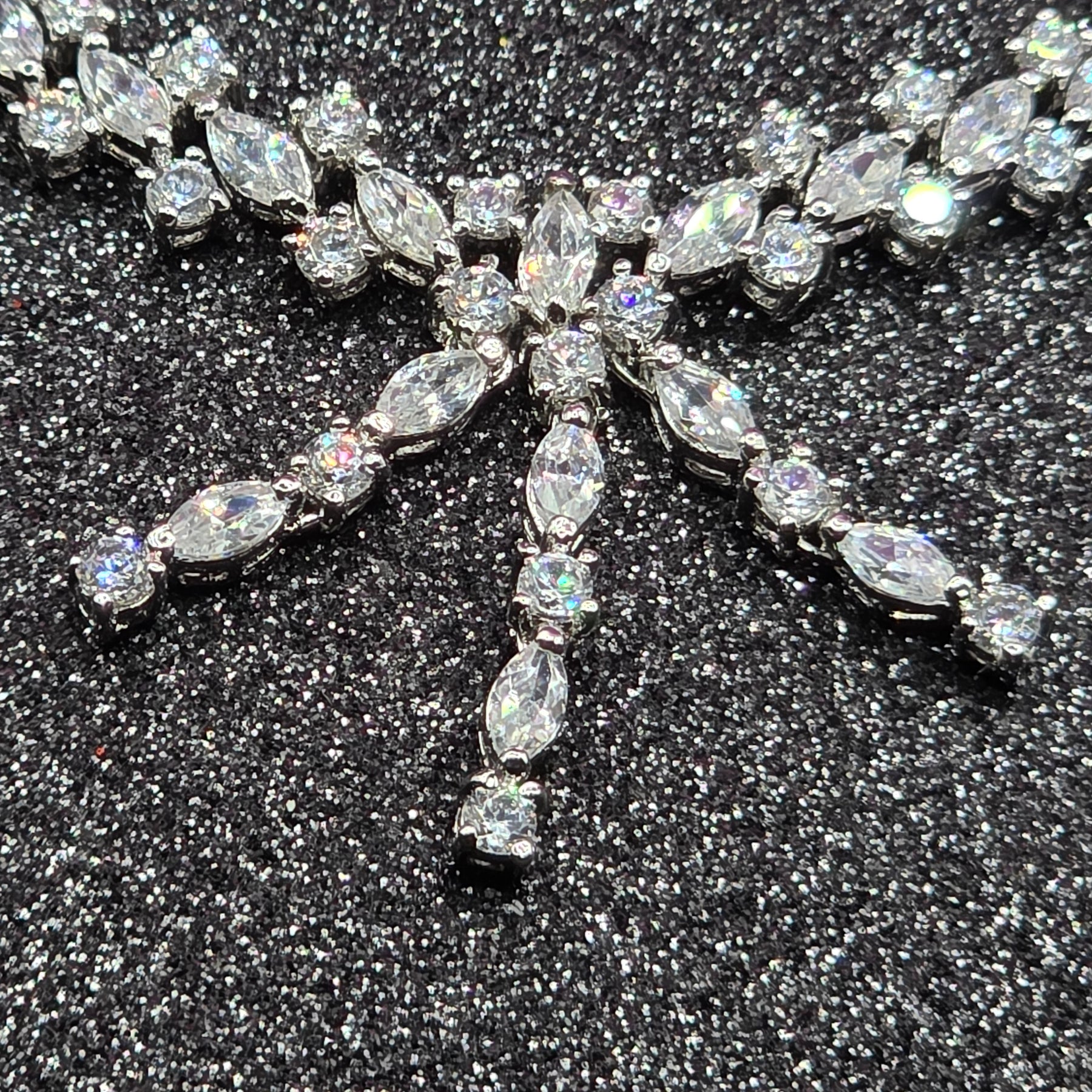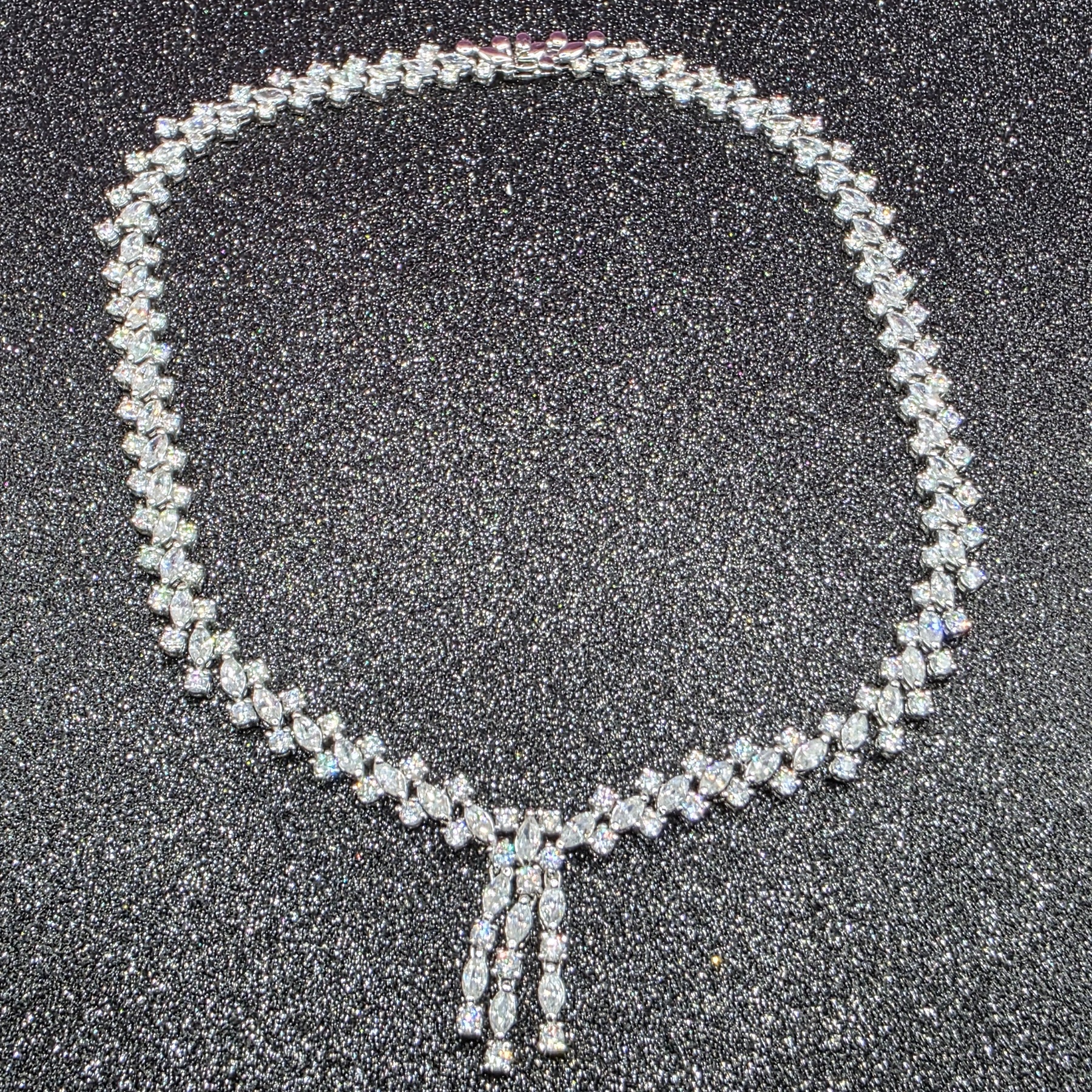 This is a gorgeous sterling silver choker length necklace. Encrusted with well over 200 crystals and 3 dangle strands. No...this piece is not white gold and diamond but nobody needs to know that. It literally looks like a princess necklace.