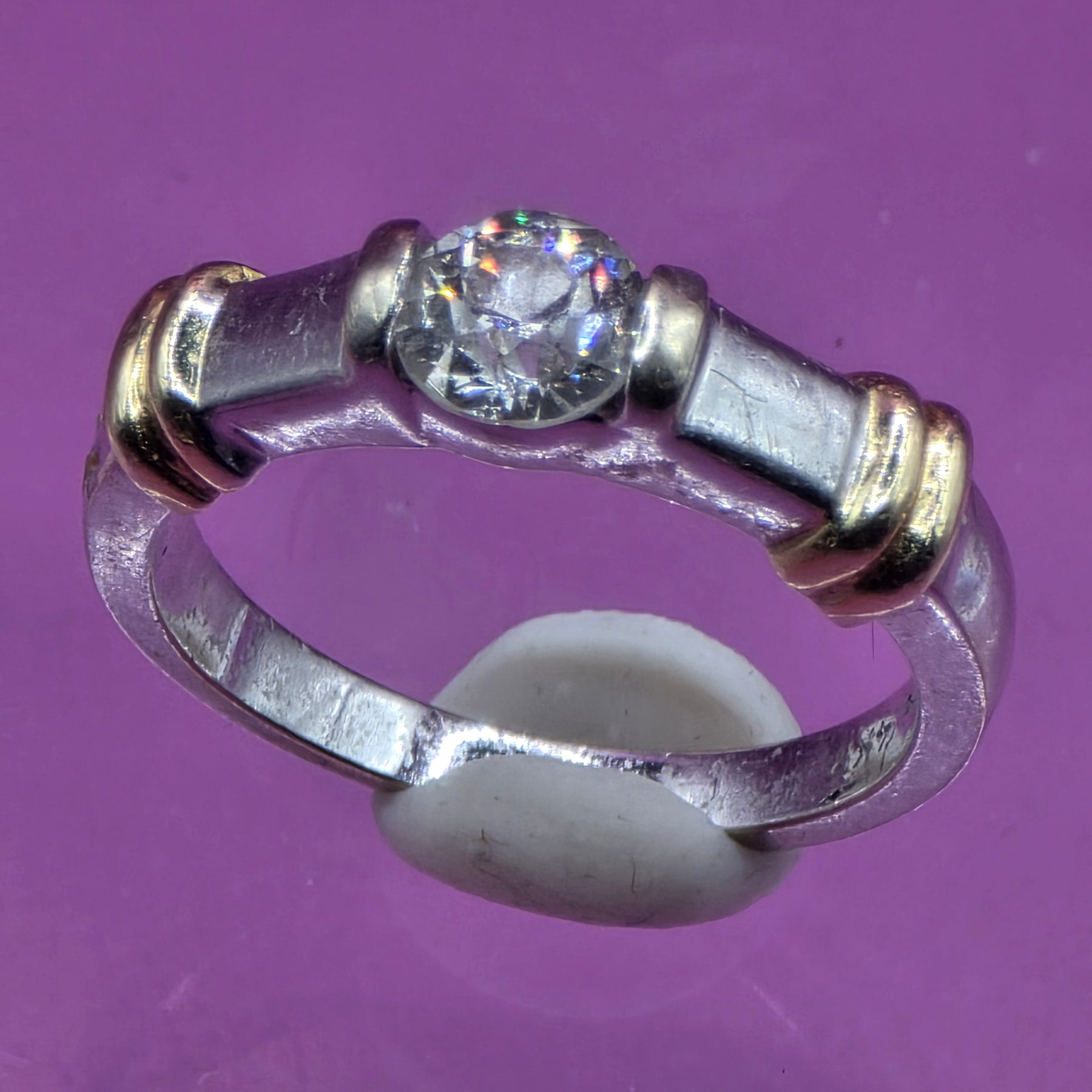 Additional info: a true classic solitaire stone white gold band style ring decorated with 2 yellow gold stations